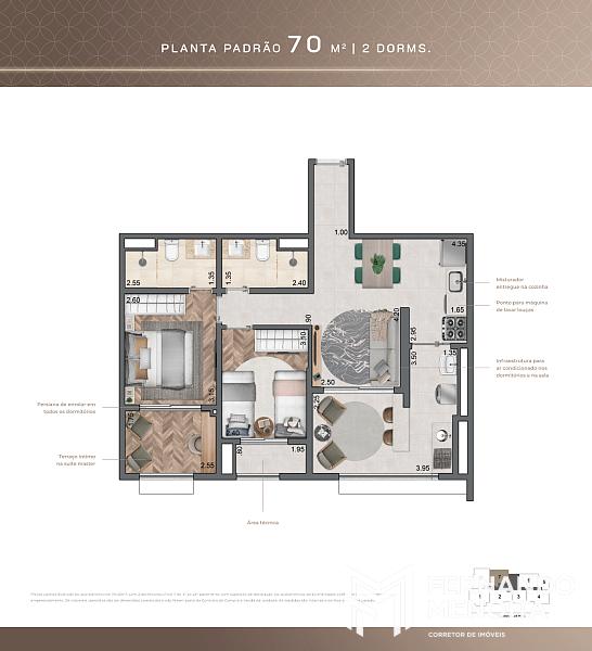 • 70 m² – 2 dormitórios (final 7 – do 3º ao 23º pavimento)