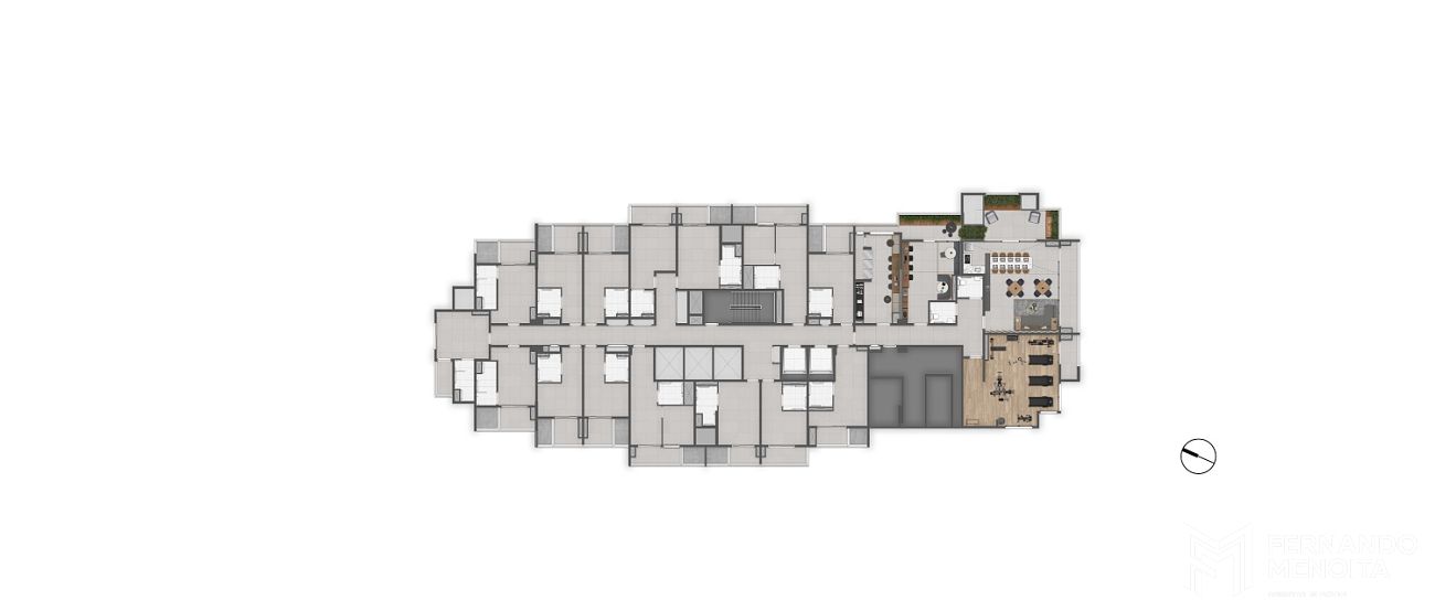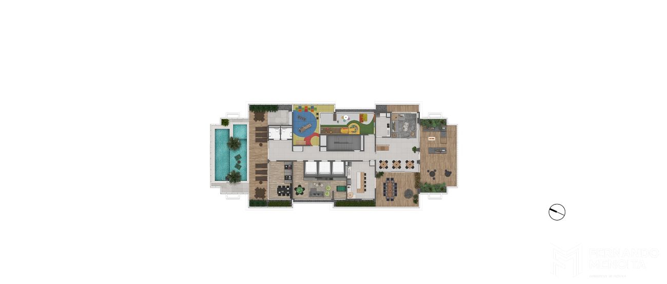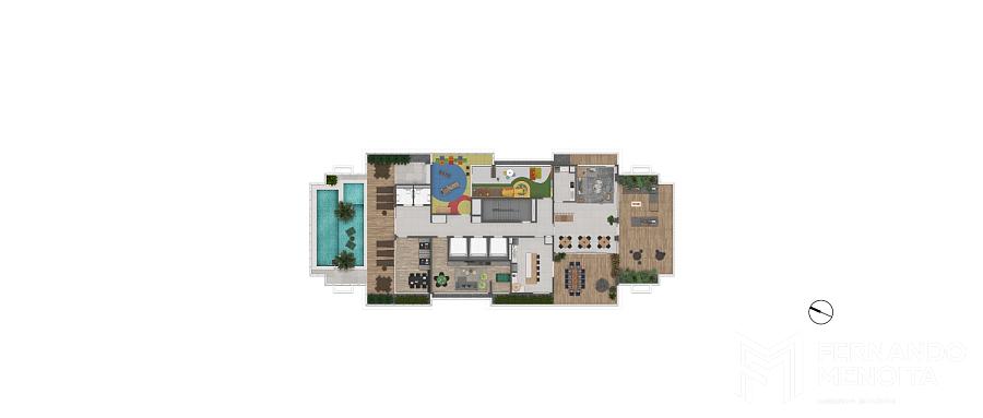 O empreendimento conta com circulação vertical independente, sendo 3 elevadores para o setor residencial e 2 elevadores para o setor de studios. O lazer residencial está concentrado nos pavimentos superiores, com destaque para o rooftop com piscinas adulto e infantil, deck molhado, solário e áreas completas de convivência.