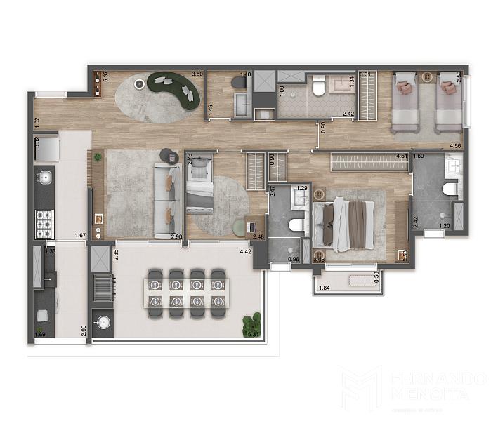 O setor residencial ocupa do 10º ao 25º pavimento e reúne apartamentos com plantas amplas de 85 m² e 104 m², com opções de 2 ou 3 dormitórios e até 3 suítes, além de 1 ou 2 vagas de garagem.