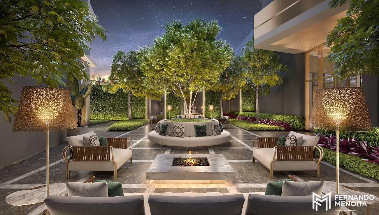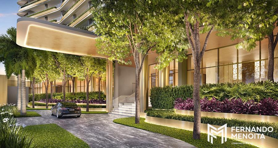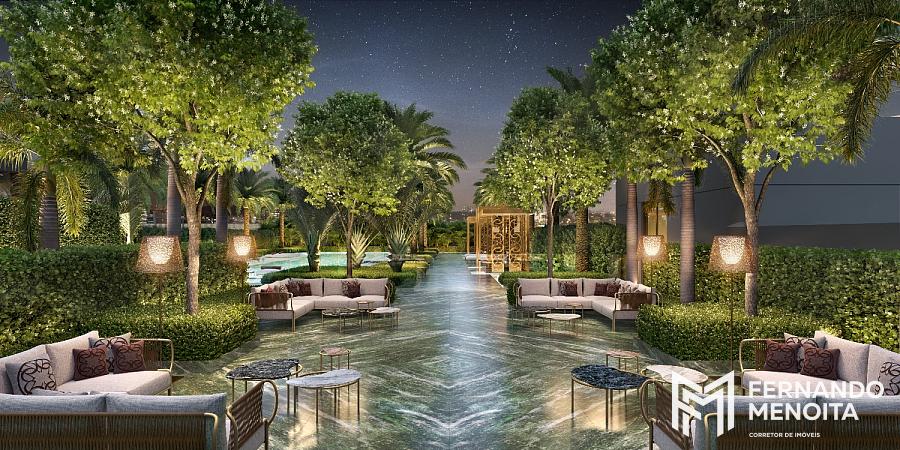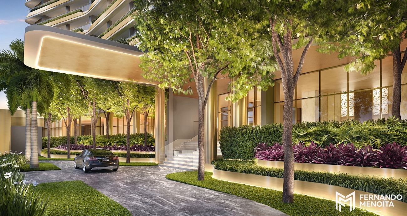 A implantação do empreendimento valoriza proporção, escala e presença urbana, com dimensões aproximadas que reforçam sua imponência, além de uma composição arquitetônica que privilegia a experiência de chegada com porte-cochère, áreas de recepção elegantes e uma organização espacial que integra lazer, convivência e privacidade.