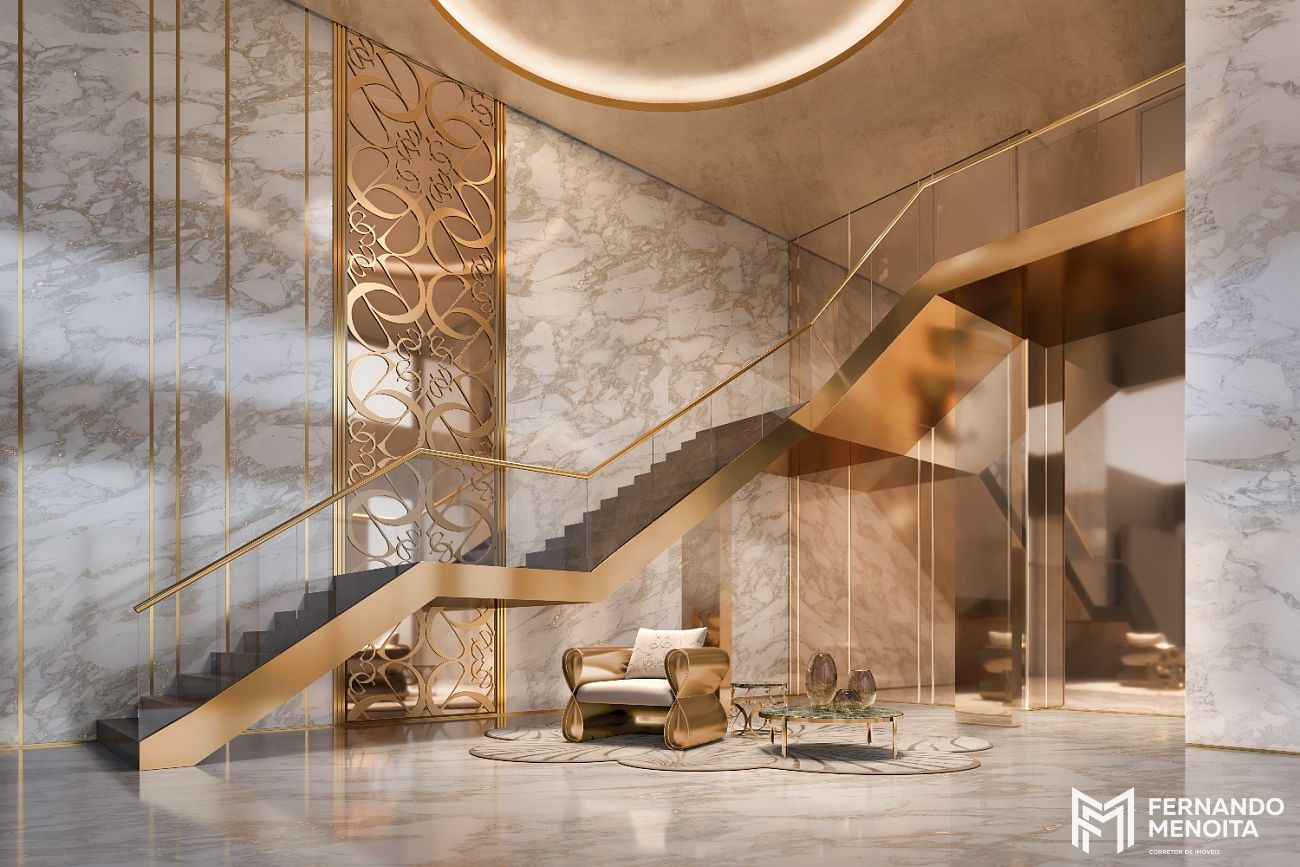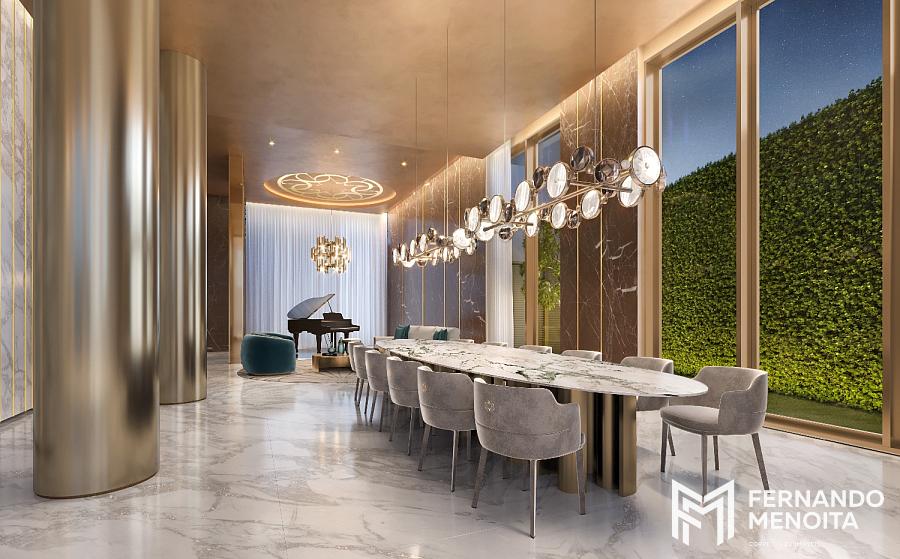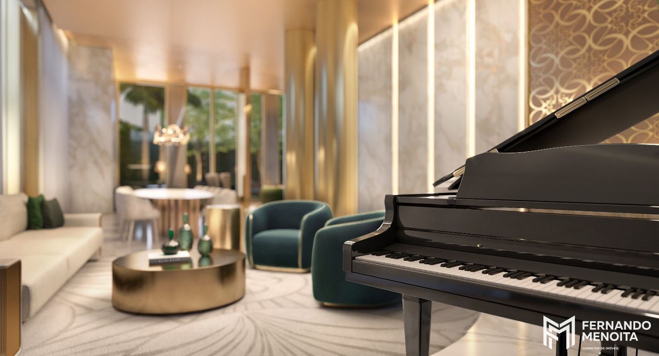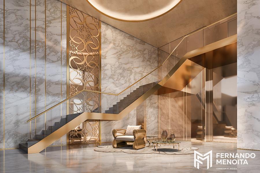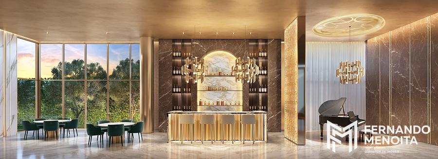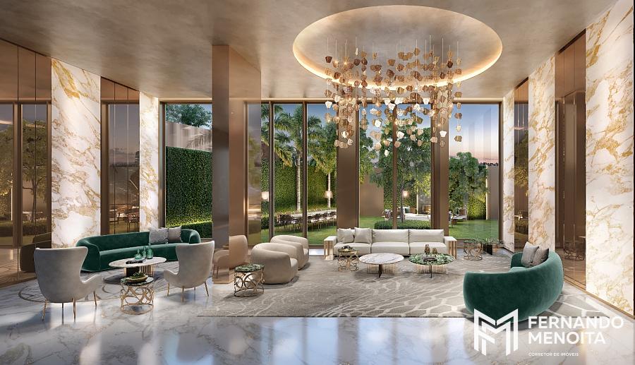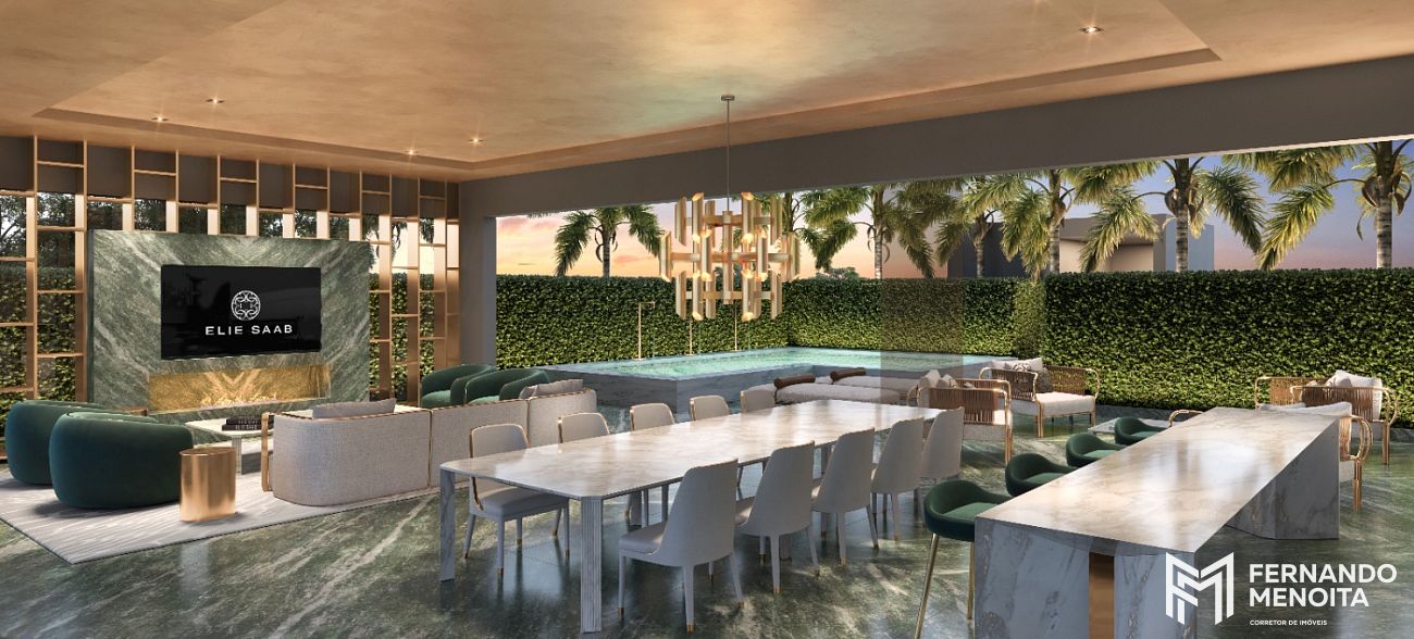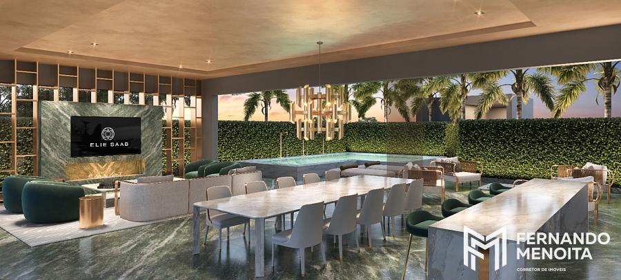 O projeto de interiores e acabamentos segue um padrão elevado, com materiais nobres cuidadosamente selecionados, como mármore Michelangelo Calacata, mármore Bronze Armani, quartzitos naturais, ônix retroiluminado, painéis metálicos exclusivos e elementos inspirados diretamente na estética da marca Elie Saab, criando ambientes que combinam luxo, textura e identidade visual marcante.
