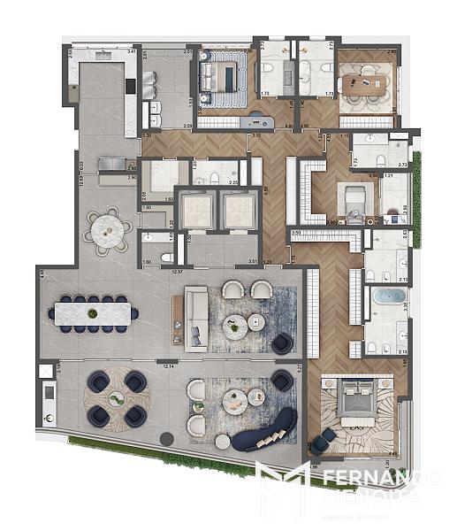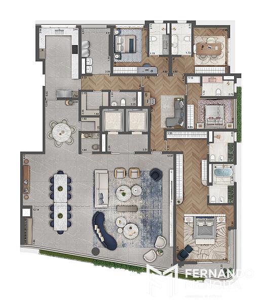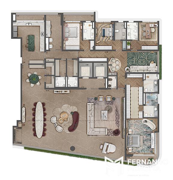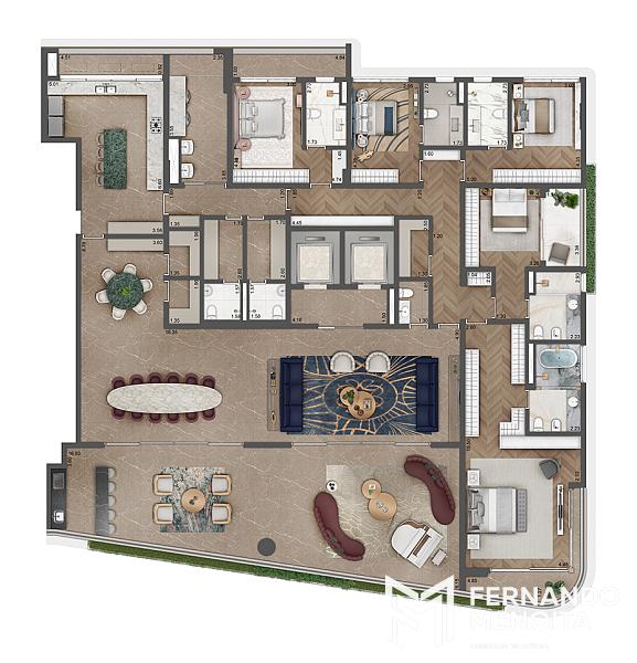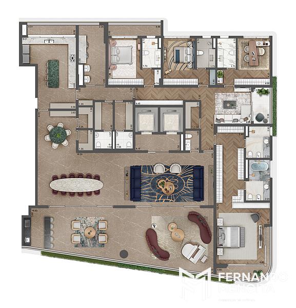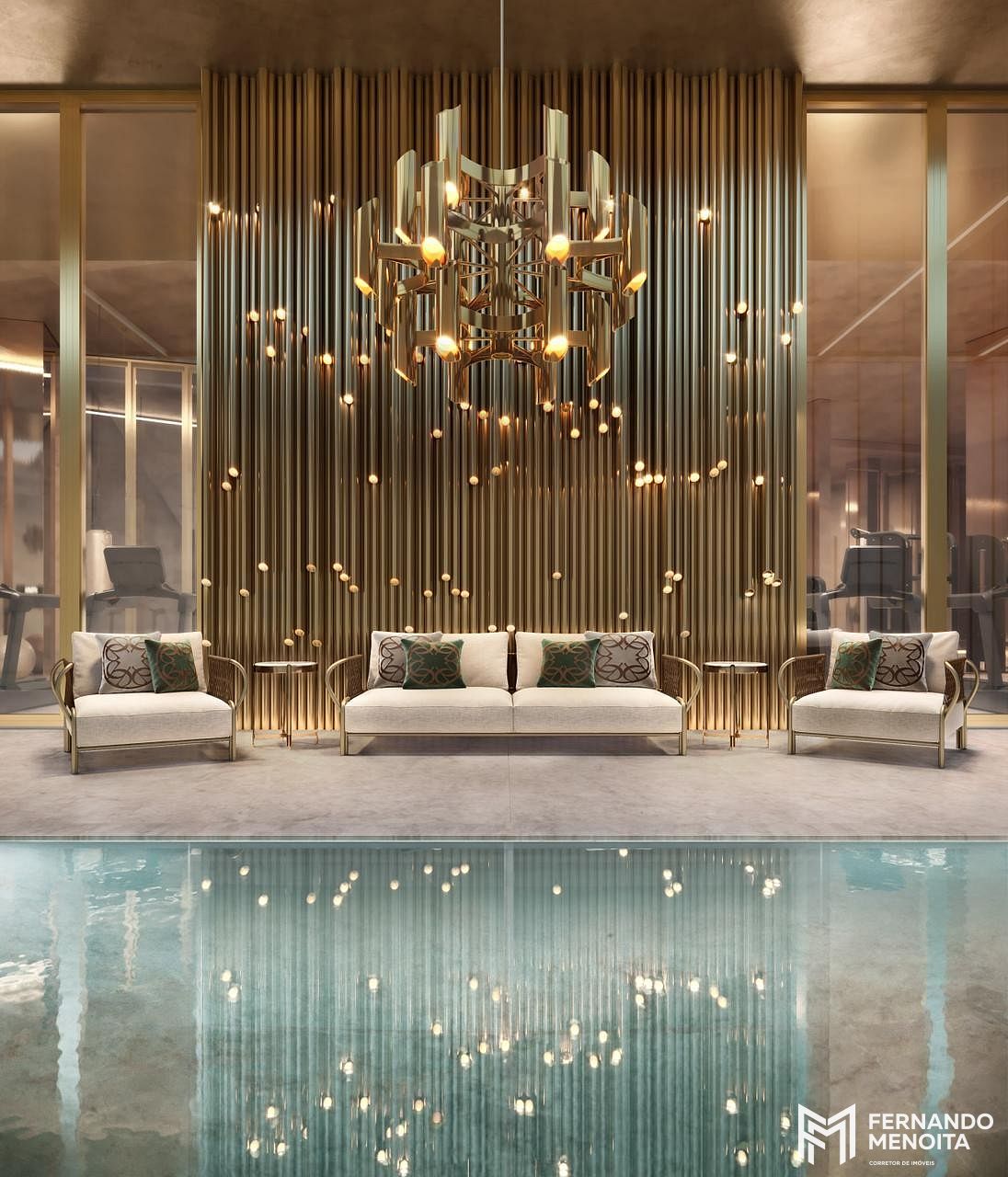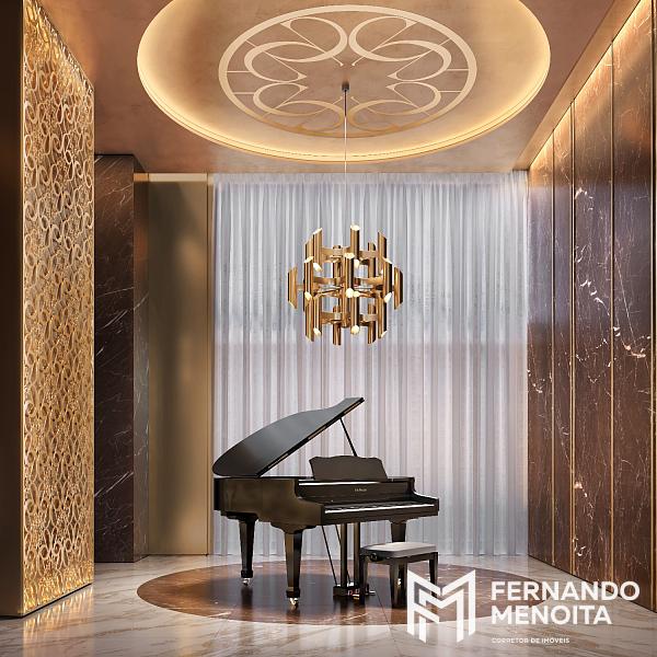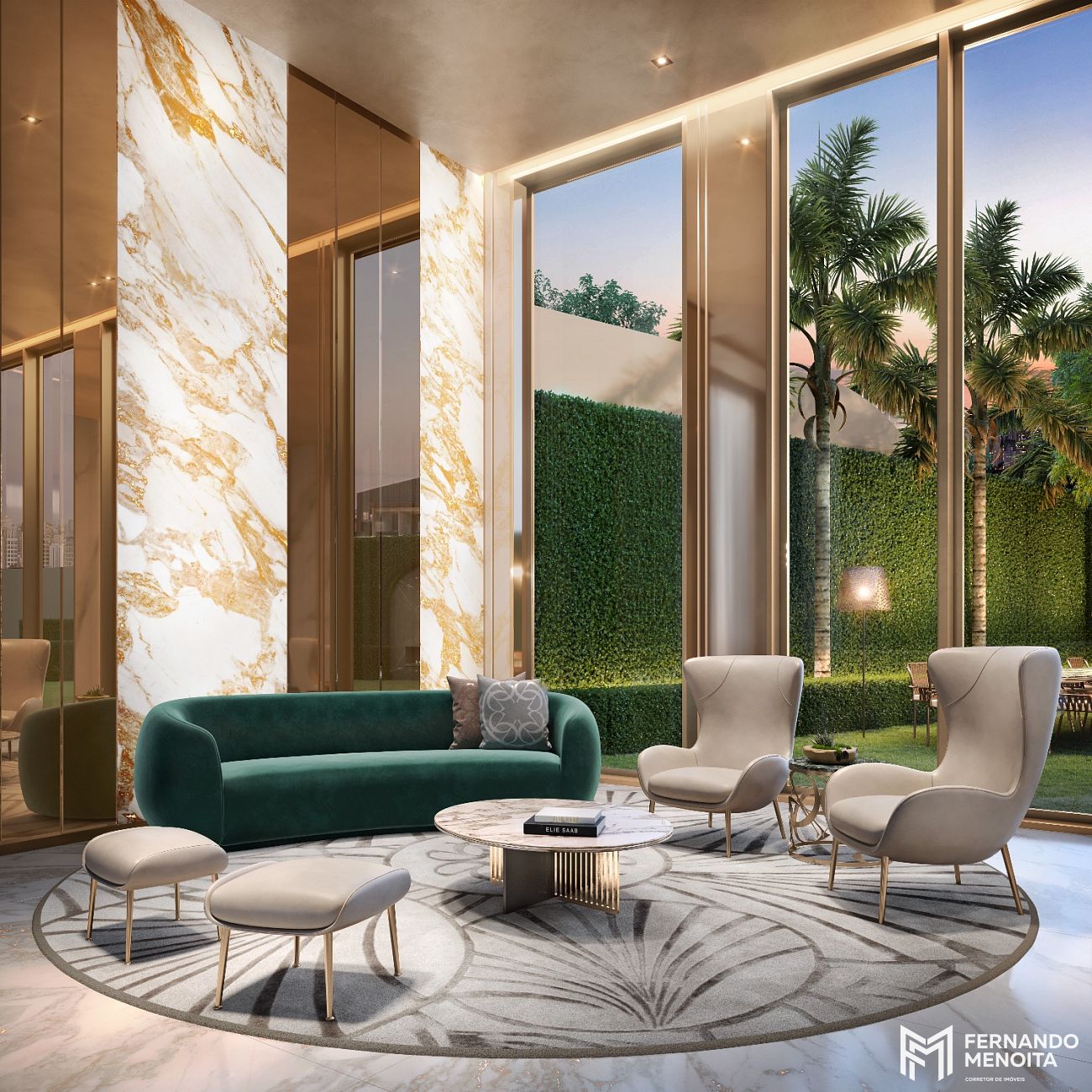 O projeto de interiores e acabamentos segue um padrão elevado, com materiais nobres cuidadosamente selecionados, como mármore Michelangelo Calacata, mármore Bronze Armani, quartzitos naturais, ônix retroiluminado, painéis metálicos exclusivos e elementos inspirados diretamente na estética da marca Elie Saab, criando ambientes que combinam luxo, textura e identidade visual marcante.