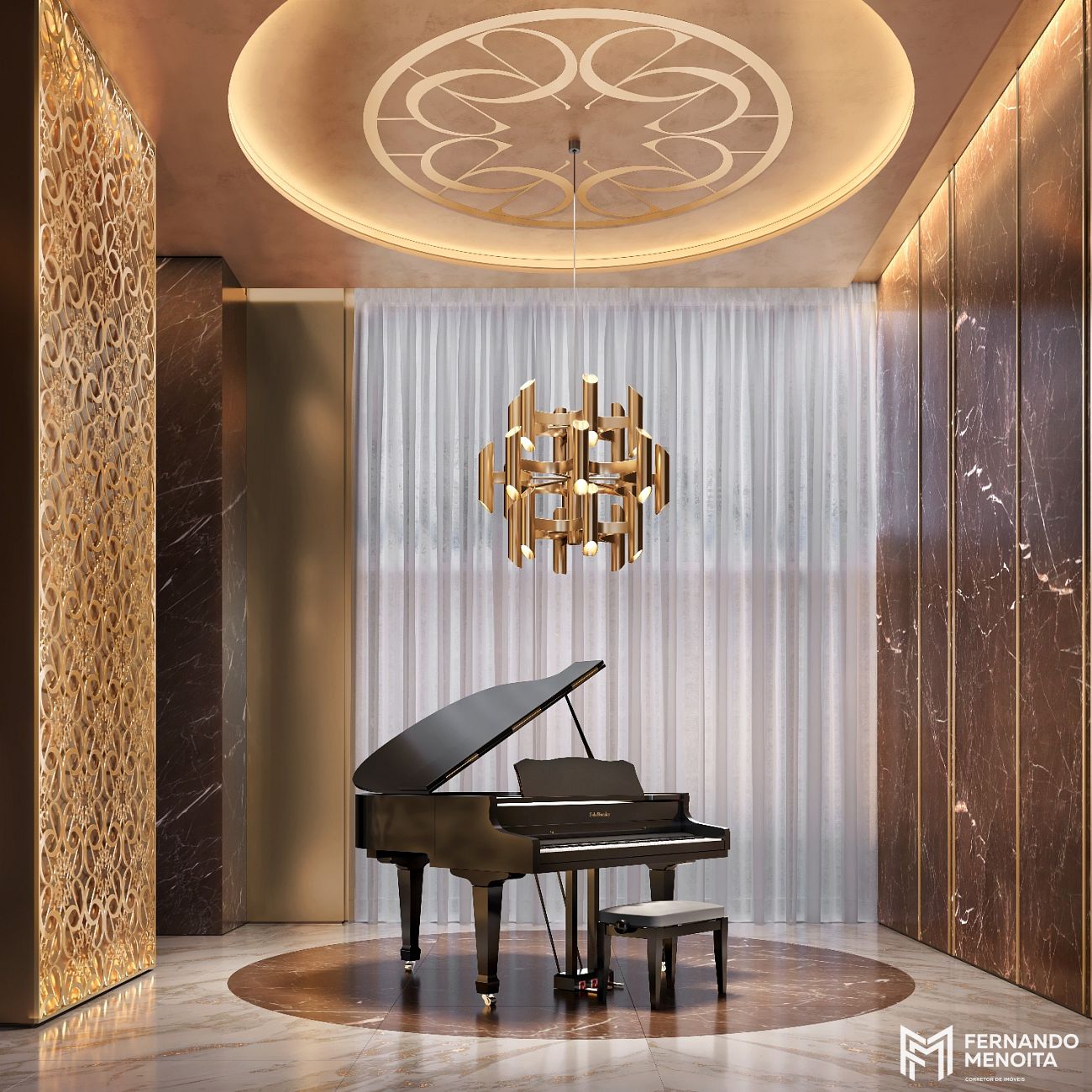 • Paredes: Espelho bronze, mármores, ônix retroiluminado, filetes metálicos, painéis exclusivos Elie Saab