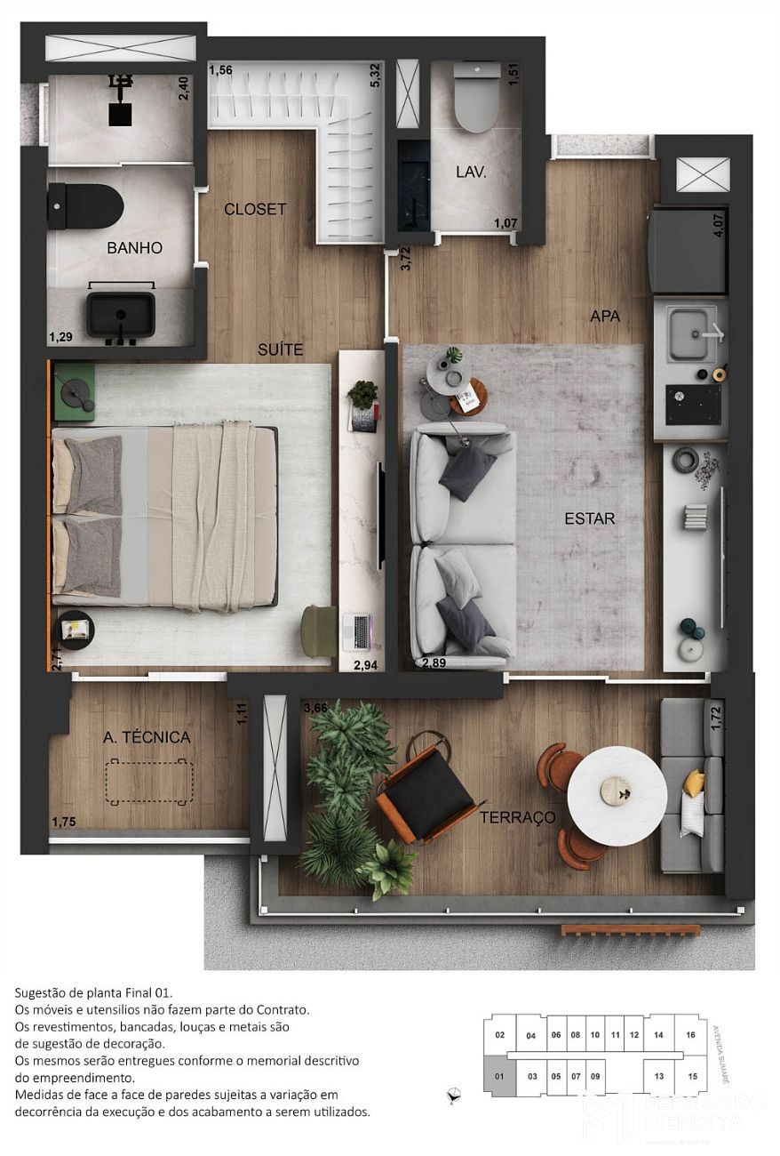 • Persiana de enrolar nas unidades de 1 dormitório com previsão para motorização