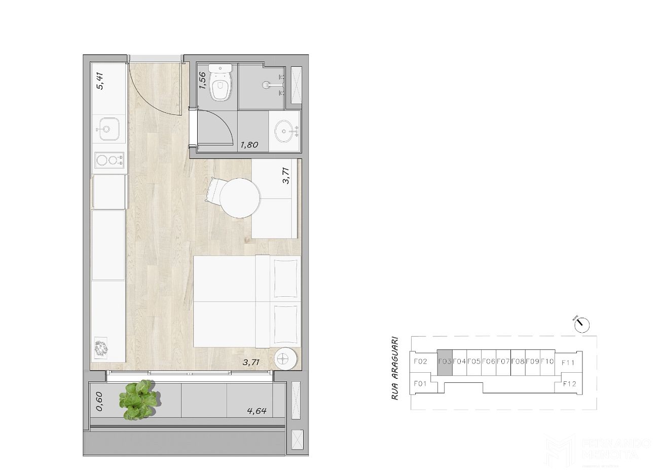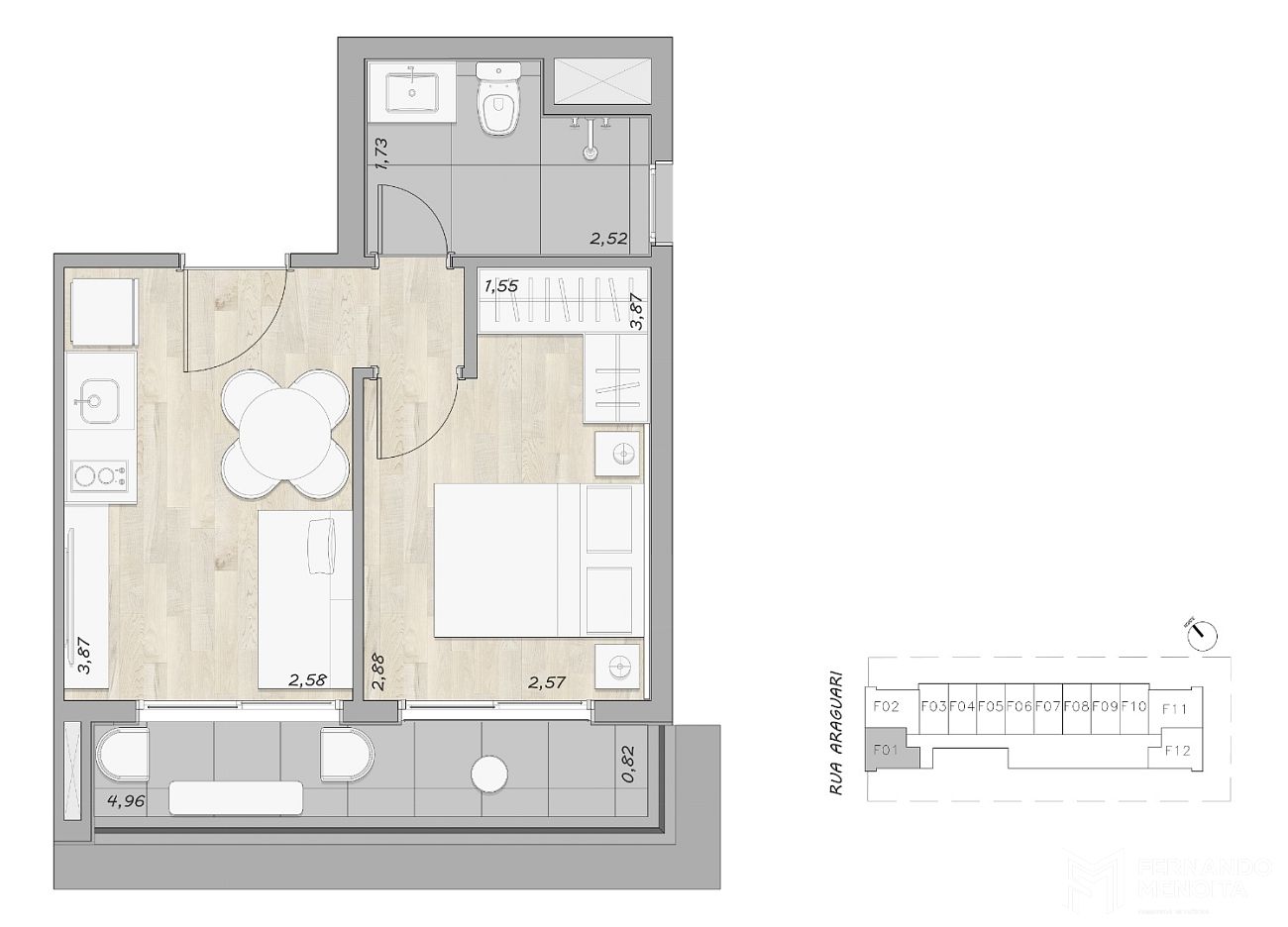 • Studios NR: 25 m² privativos – 3º e 4º pavimentos