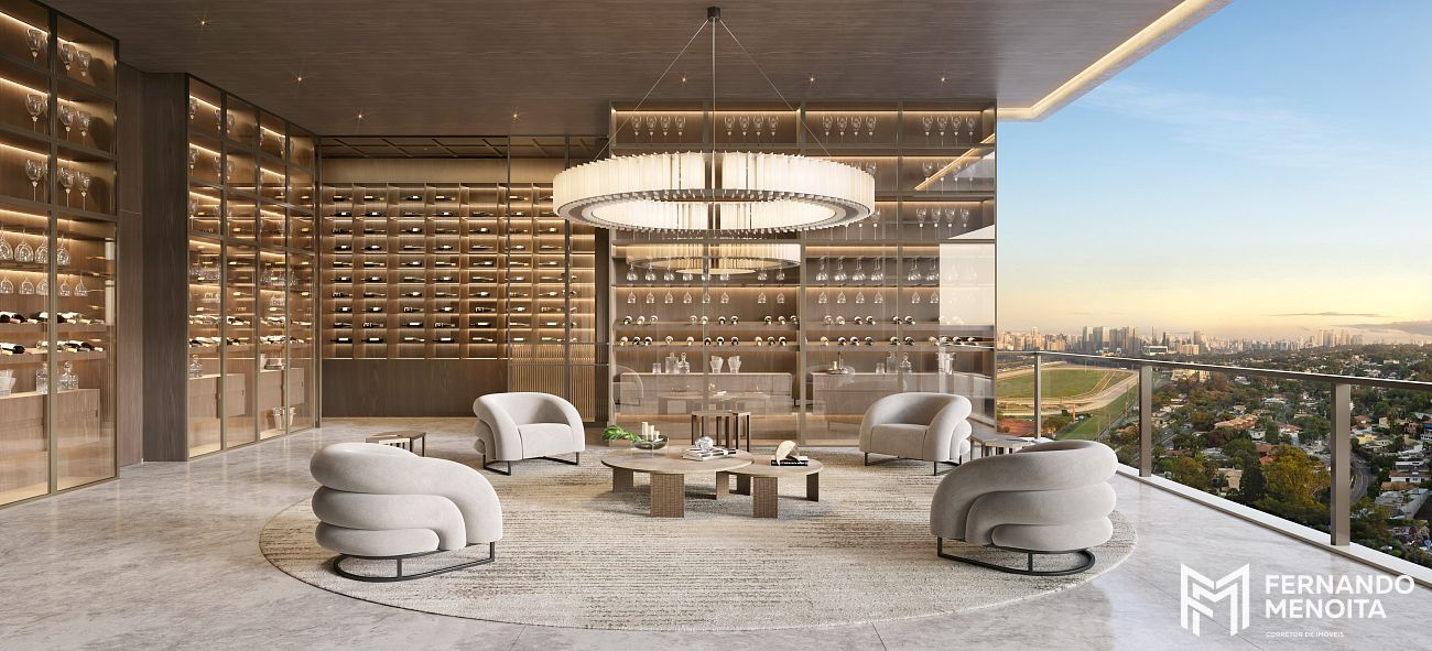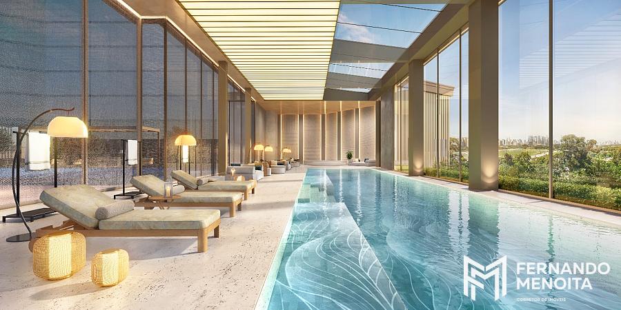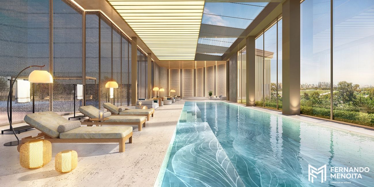 O projeto oferece infraestrutura completa de lazer distribuída em diferentes pavimentos, incluindo piscina coberta e descoberta, quadra de tênis, spa, floating gym, lounges panorâmicos, espaços de wellness, áreas de convivência e ambientes dedicados ao relaxamento e bem-estar.