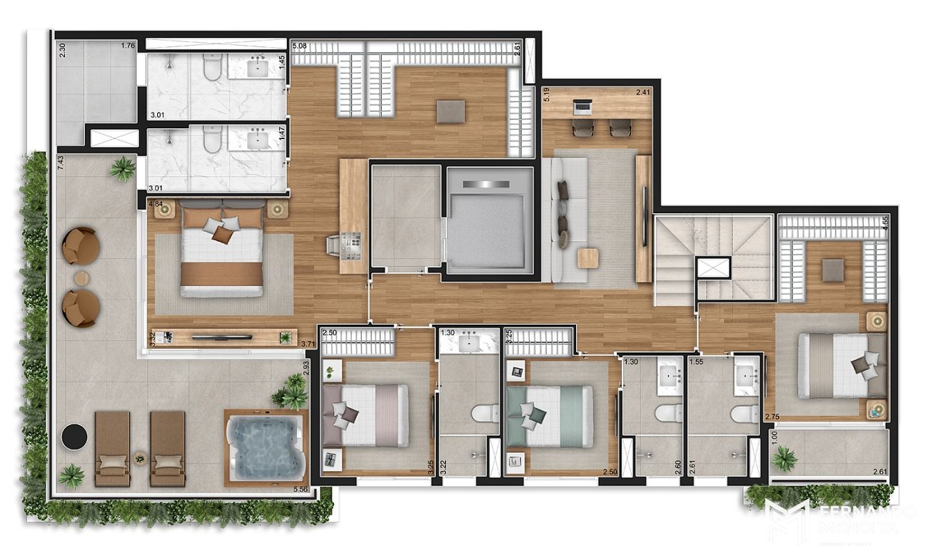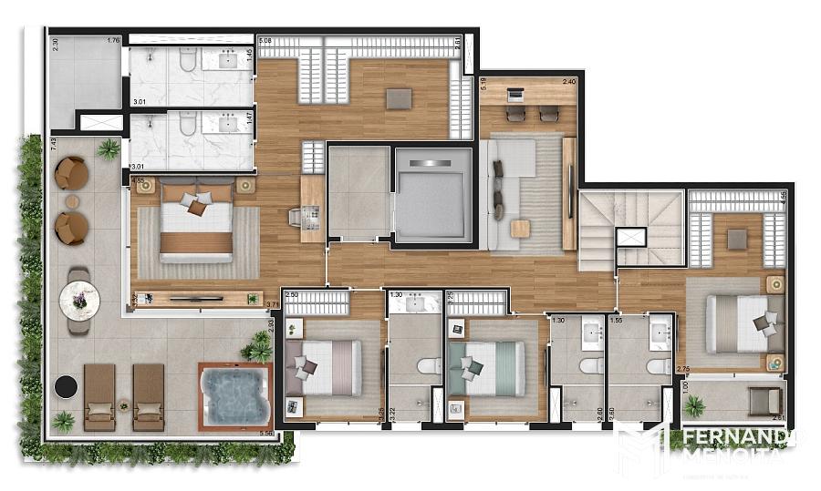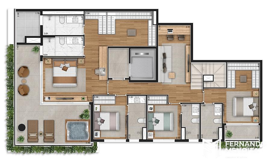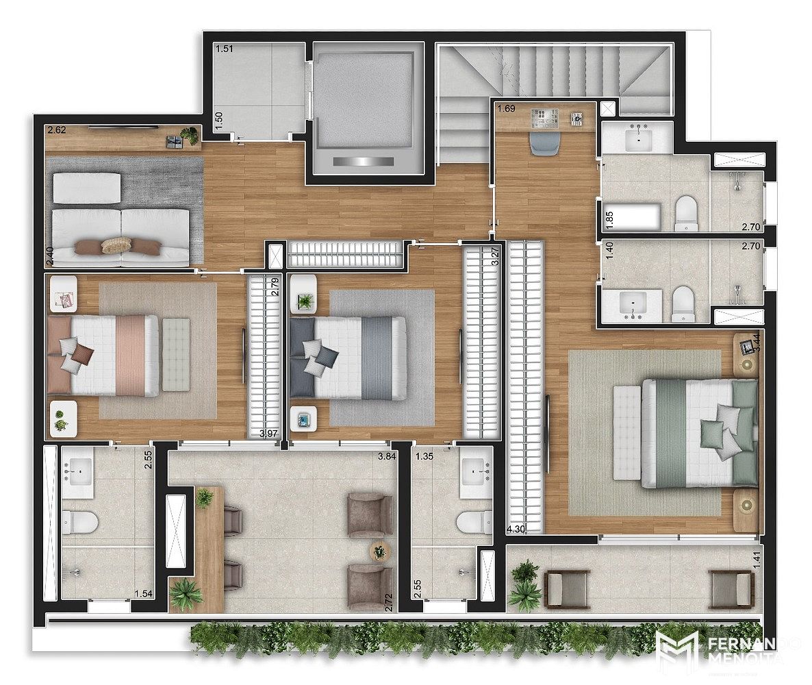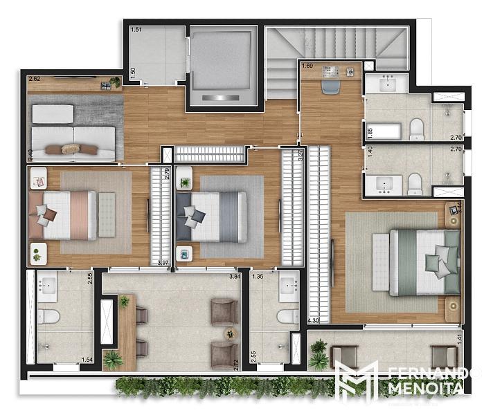 Os apartamentos apresentam metragens generosas, com opções de 124,75 m² e 167,95 m² nas unidades tipo, além de coberturas duplex de 252,80 m² e 313,10 m², todas projetadas para atender famílias que buscam espaço, funcionalidade e sofisticação. As unidades contam com infraestrutura completa para ar-condicionado, terraços com previsão para churrasqueira e acabamentos alinhados a um padrão elevado de moradia.