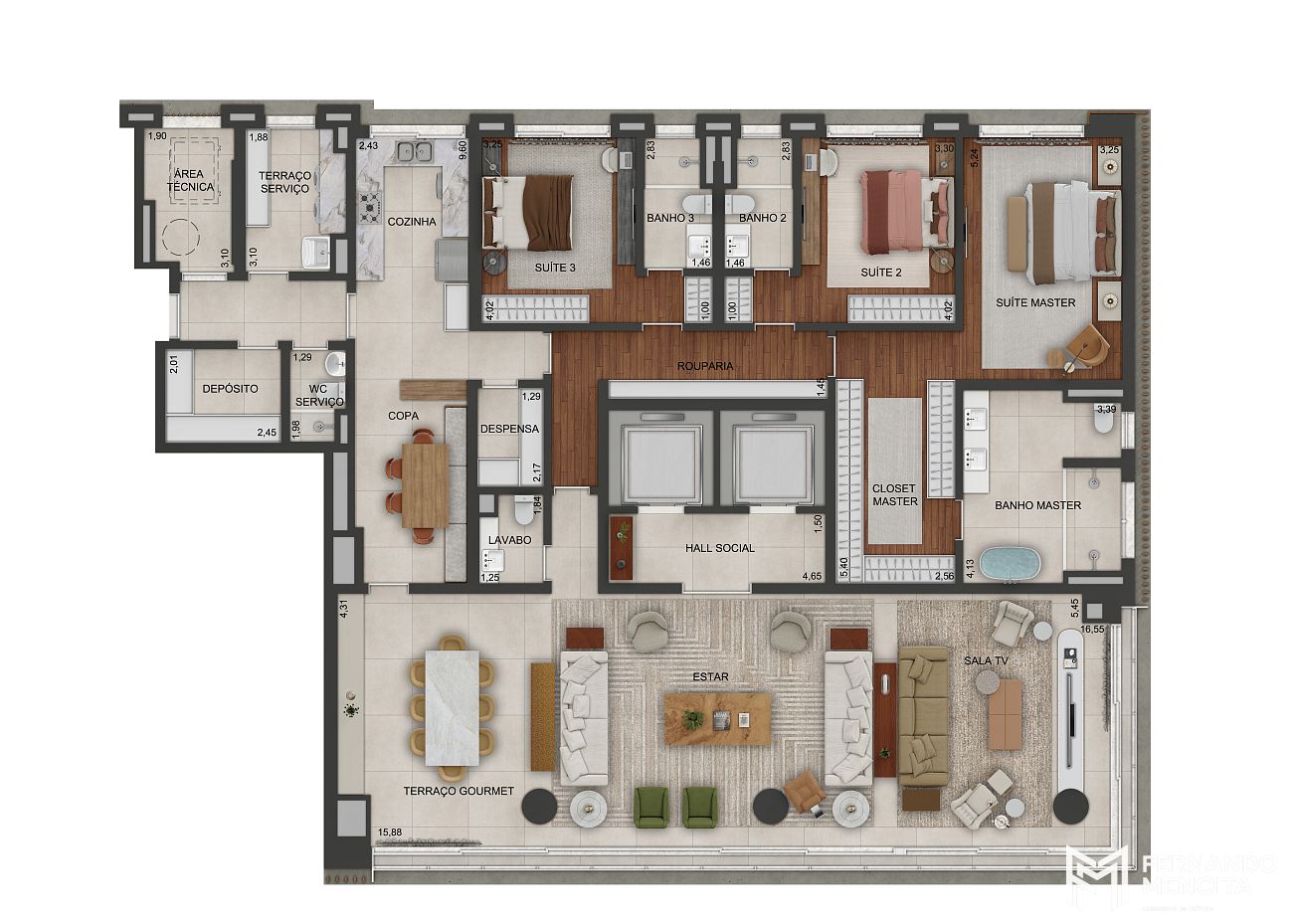 • Área técnica para máquinas de ar-condicionado e boiler separada da área de serviço