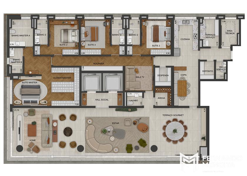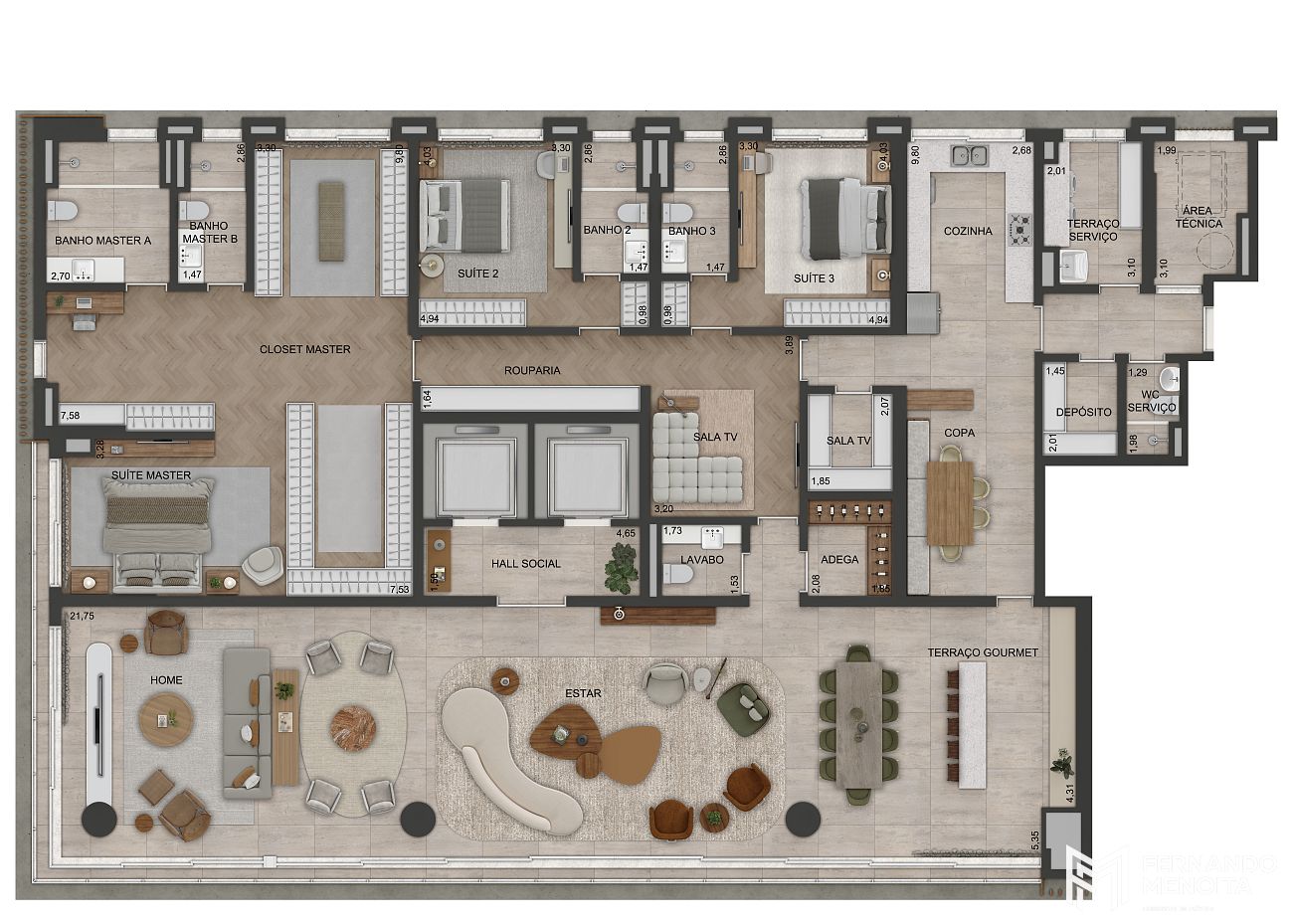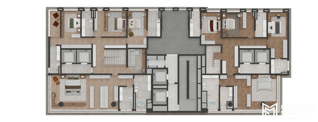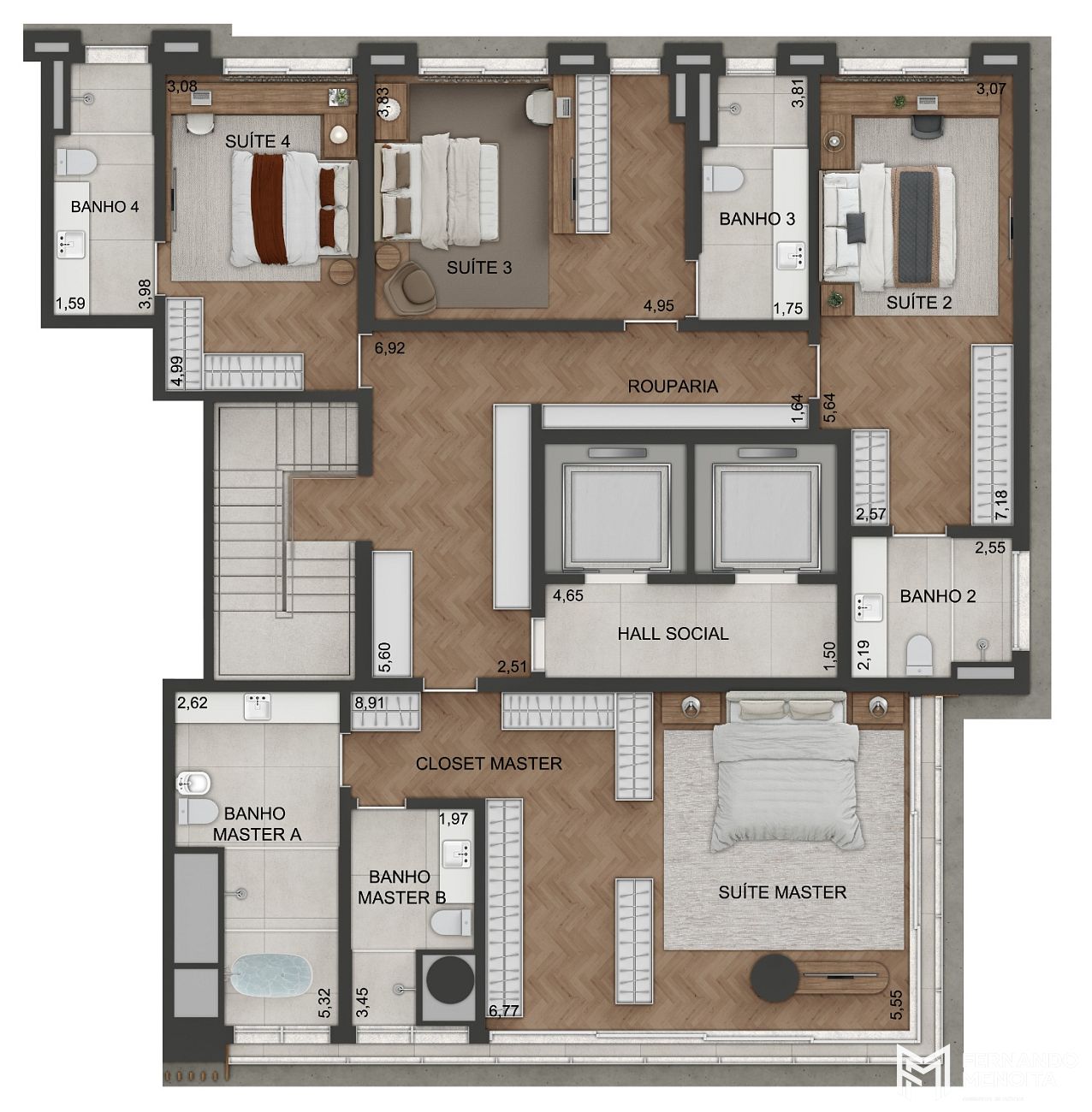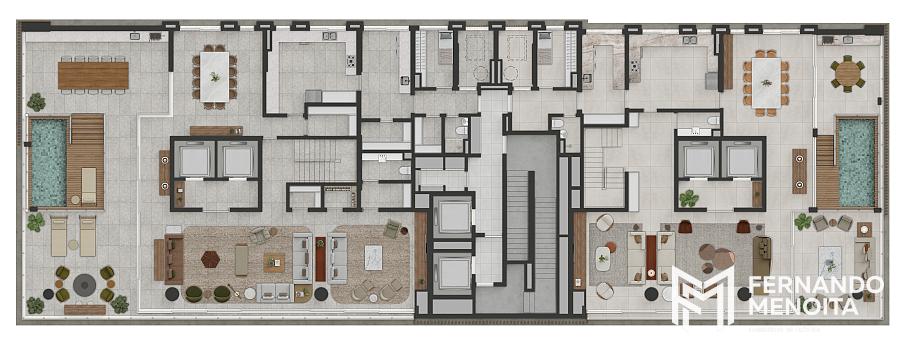 Com apartamentos amplos e sofisticados, o projeto oferece plantas de 293 m² e 373 m², além de unidades especiais como duplex superior, duplex inferior e mezanino, atendendo a um público que busca exclusividade, conforto absoluto e alto nível de acabamento.
