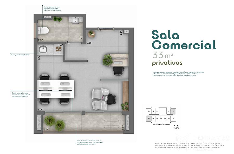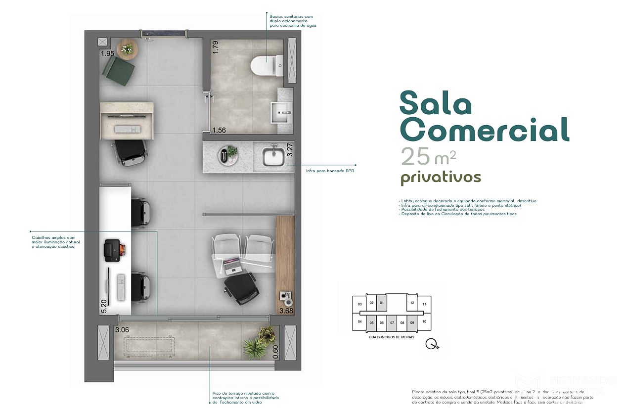 Inseridas em um empreendimento multiuso, as salas comerciais se beneficiam diretamente da integração com studios residenciais, unidades de 1 dormitório e um Mall ComVem no térreo, fator que gera fluxo constante de usuários, conveniência diária e valorização contínua do ativo.