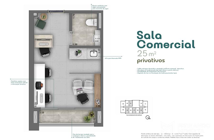 Com metragens de 25m² e 33m², essa tipologia foi desenvolvida para atender profissionais liberais, consultórios, escritórios e empresas de serviços que buscam funcionalidade, endereço qualificado e alto potencial de liquidez. As plantas são compactas e eficientes, permitindo múltiplas configurações de layout e excelente aproveitamento dos espaços.