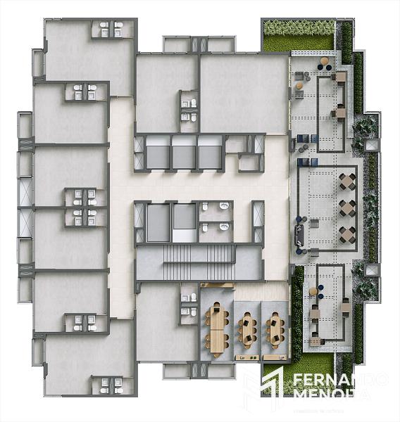 No último pavimento, o projeto oferece uma área exclusiva voltada ao suporte profissional, com auditório, salas de reunião e sky lounge, promovendo integração, networking e ambiente corporativo de alto nível para médicos e operadores de saúde.