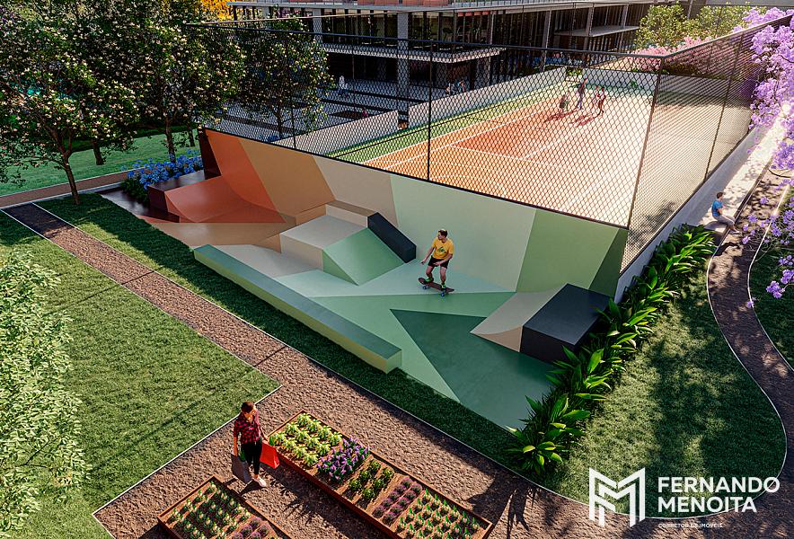 O empreendimento também incorpora soluções sustentáveis, como previsão para placas solares, sistema de reaproveitamento e gestão de água, poço tubular profundo e irrigação automatizada, alinhando eficiência operacional com responsabilidade ambiental.