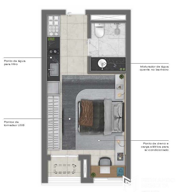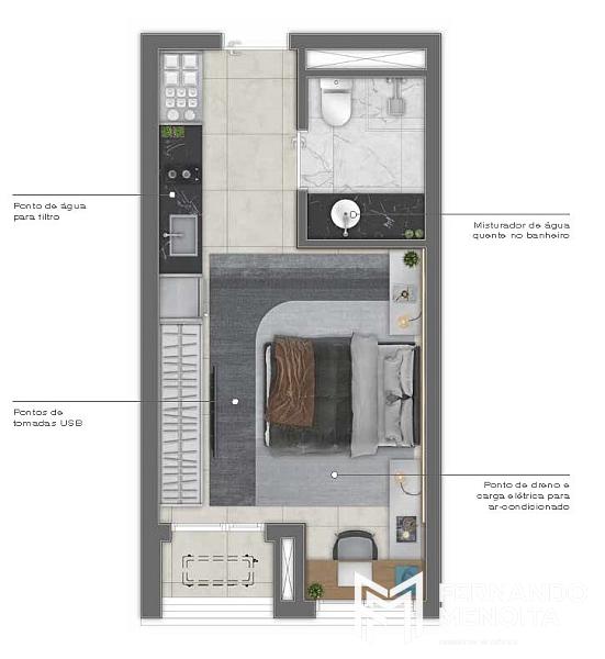 As unidades são do tipo studio, com metragens de 26 a 32m², projetadas para oferecer funcionalidade, aproveitamento inteligente dos espaços e facilidade de operação. O empreendimento é voltado exclusivamente para Serviço de Moradia (NR), com infraestrutura adequada para atender às novas demandas de ocupação urbana.
