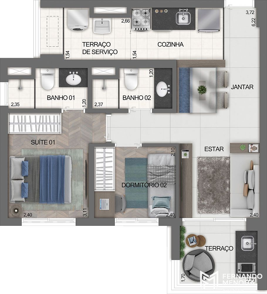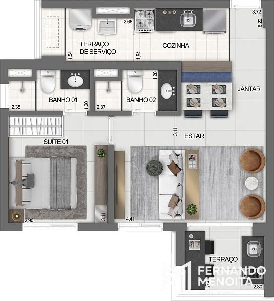 • Apartamentos residenciais: de 51,71 m² a 54,50 m²