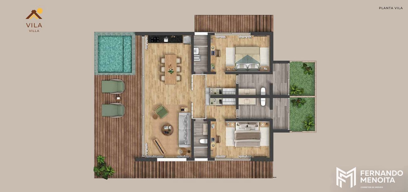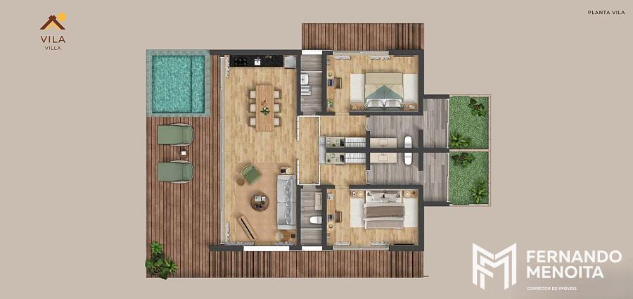 As vilas foram projetadas para proporcionar integração total com a natureza, com arquitetura que valoriza materiais naturais, ventilação cruzada, iluminação abundante e conexão direta com o entorno, incluindo áreas externas com deck, piscina privativa e ambientes sociais integrados, conforme demonstrado nas plantas e perspectivas do projeto.
